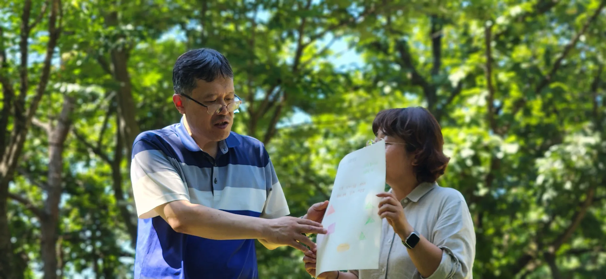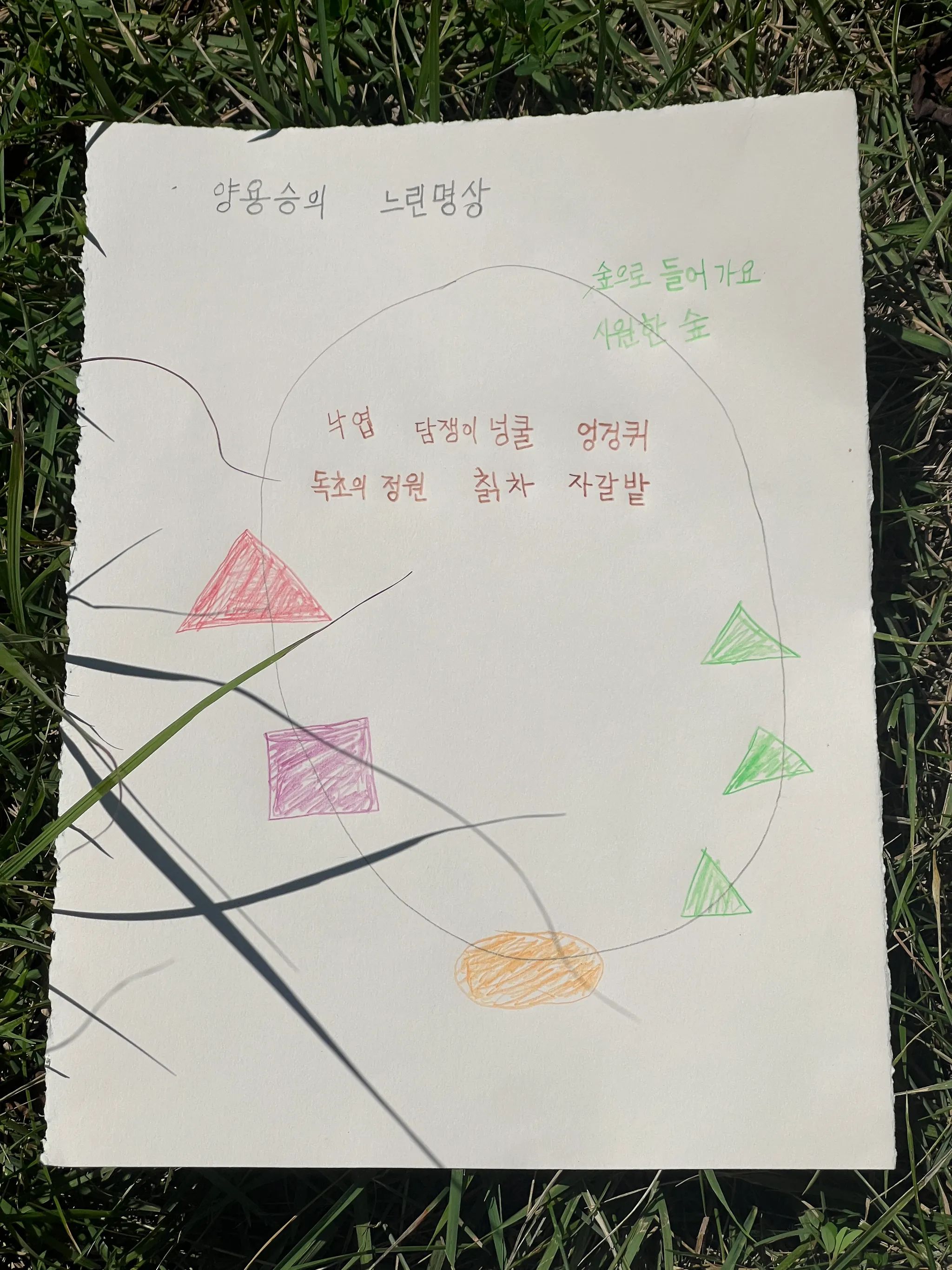 양용승님은 프로그램 전 기간 동안 세심하고 정확한 태도로 활동에 참여해주셨습니다. 나무 이름표를 또박또박 정성스럽게 써서 나무에 붙이시는 모습, 나무에 단순한 선으로 얼굴의 표정을 만드는 창의적인 작업에서 양용승님의 섬세한 손길이 느껴졌어요. 특히 "양용승의 느린 명상"이라는 제목으로 그리신 작품에서는 느린명상길 중간에 보이는 알록달록한 삼각형들이 귀여운 일러스트처럼 표현되어 있어 양용승님만의 독특한 감각이 빛났습니다. 양용승님이 기록하신 나무의 이름과 나이, 그리고 하나하나 만들어주신 작품들은 단순한 결과물이 아니라 생태힐링길을 함께 걸으며 나눈 소중한 순간들의 기억이자, 이 프로그램의 의미를 오래도록 남겨줄 귀중한 기록입니다. 양용승님과 함께한 모든 순간들이 감사하고, 앞으로도 계속 아름다운 기록을 만들어가시길 응원합니다.
