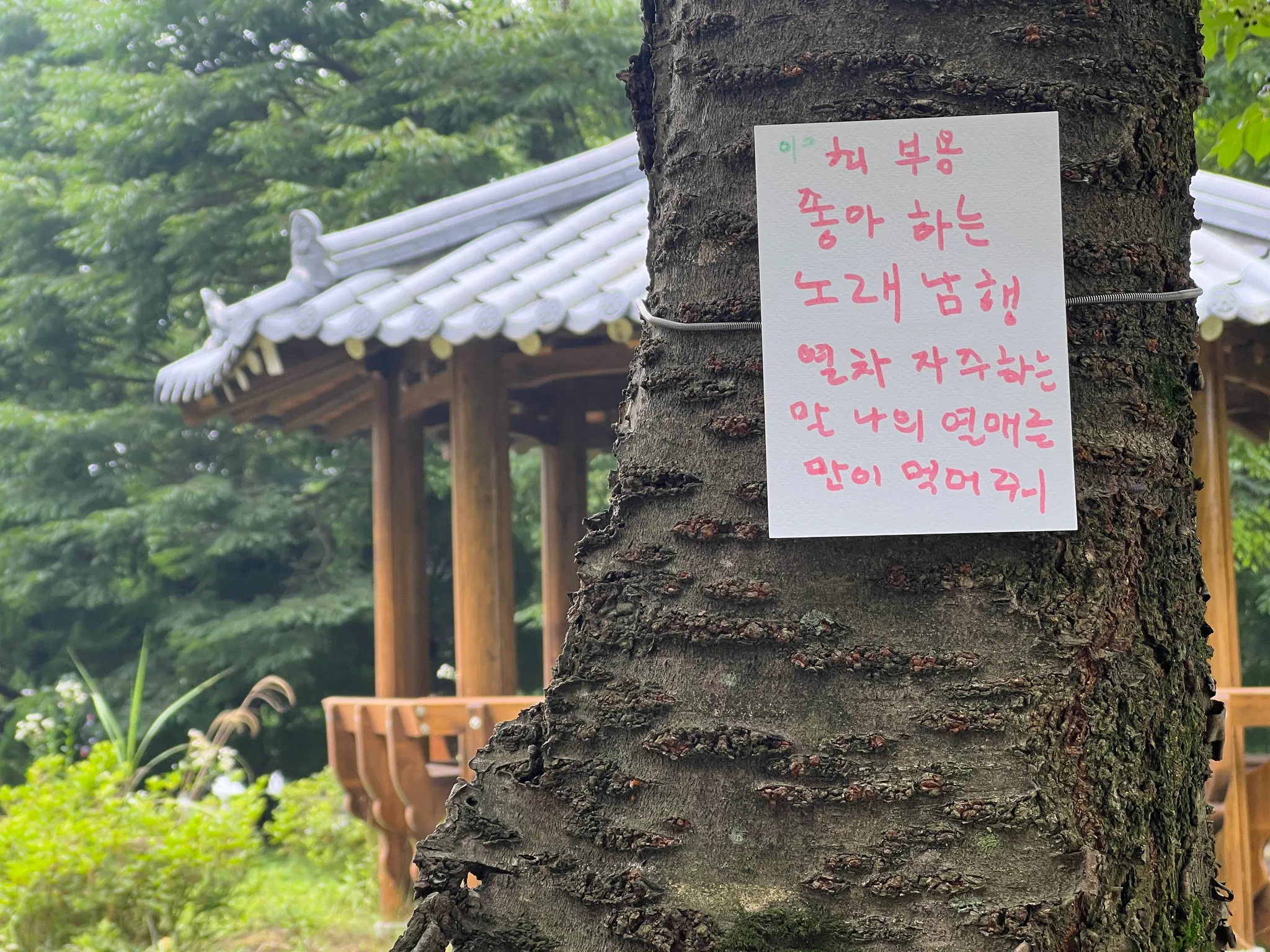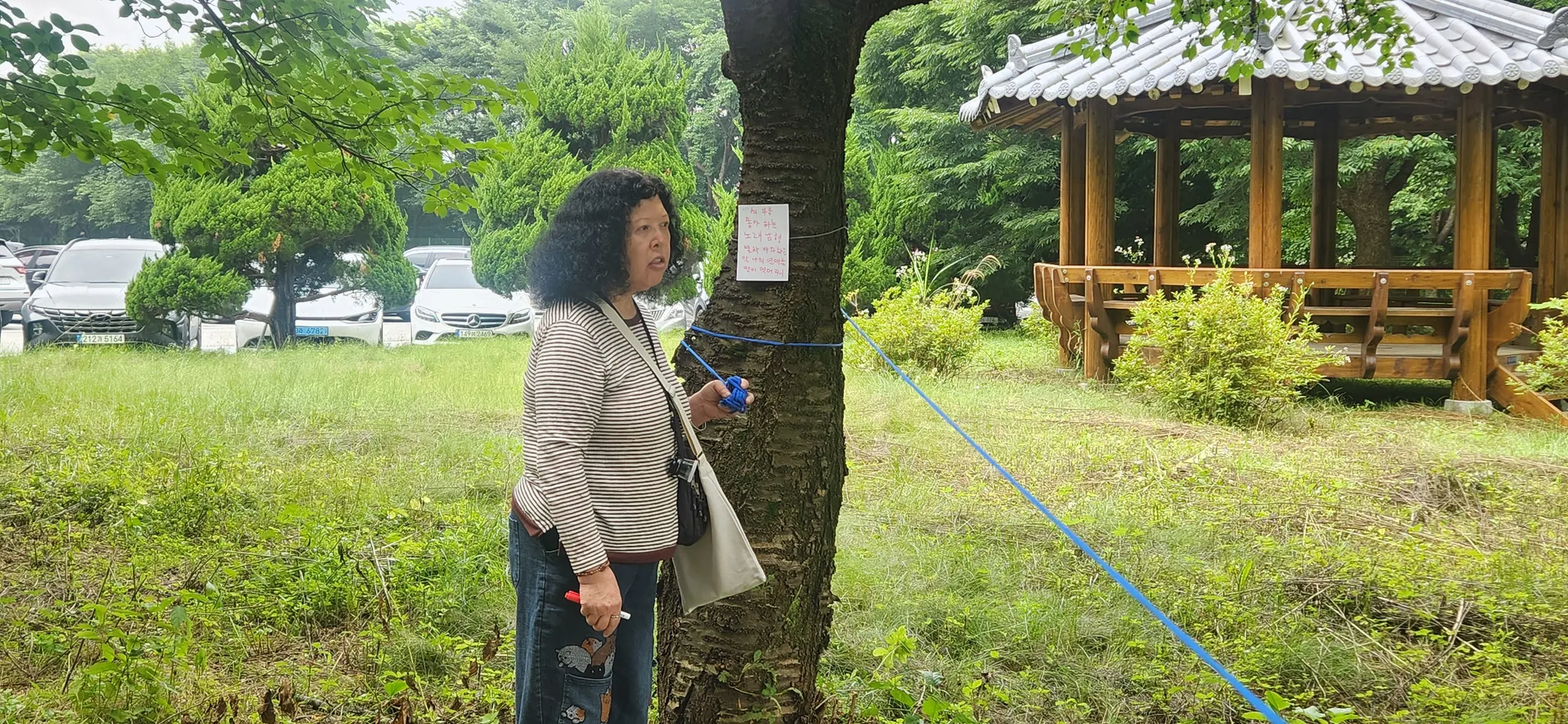 최부용님은 프로그램 내내 밝고 긍정적인 에너지로 활동 현장을 활기차게 만들어주셨습니다. 더운 여름 야외를 누비실 때도, 나무에 시적인 메시지를 적으실 때도 항상 환한 미소를 잃지 않으셨어요. "최부용의 느린 명상"이라는 제목으로 그리신 작품에는 나비와 산딸기꽃, 찔레꽃이 섬세하게 표현되어 있고, 알록달록한 꽃다발 그림에서는 최부용님이 즐겨 쓰시는 밝고 환한 색감이 가득 담겨 있어 보는 이의 마음까지 따뜻해집니다. 특히 유토로 만든 나무의 얼굴 옆에서 활짝 웃으신 모습을 보면 최부용님의 유쾌하고 창의적인 면모가 그대로 드러납니다. 손수건에 식물을 눌러 염색하는 작업에서도 최부용님만의 색과 형태가 살아있고, 하나하나 정성스럽게 완성하신 작품들은 생태힐링길을 걸으며 느낀 감정과 기억을 생생하게 전해주는 소중한 기록입니다.
